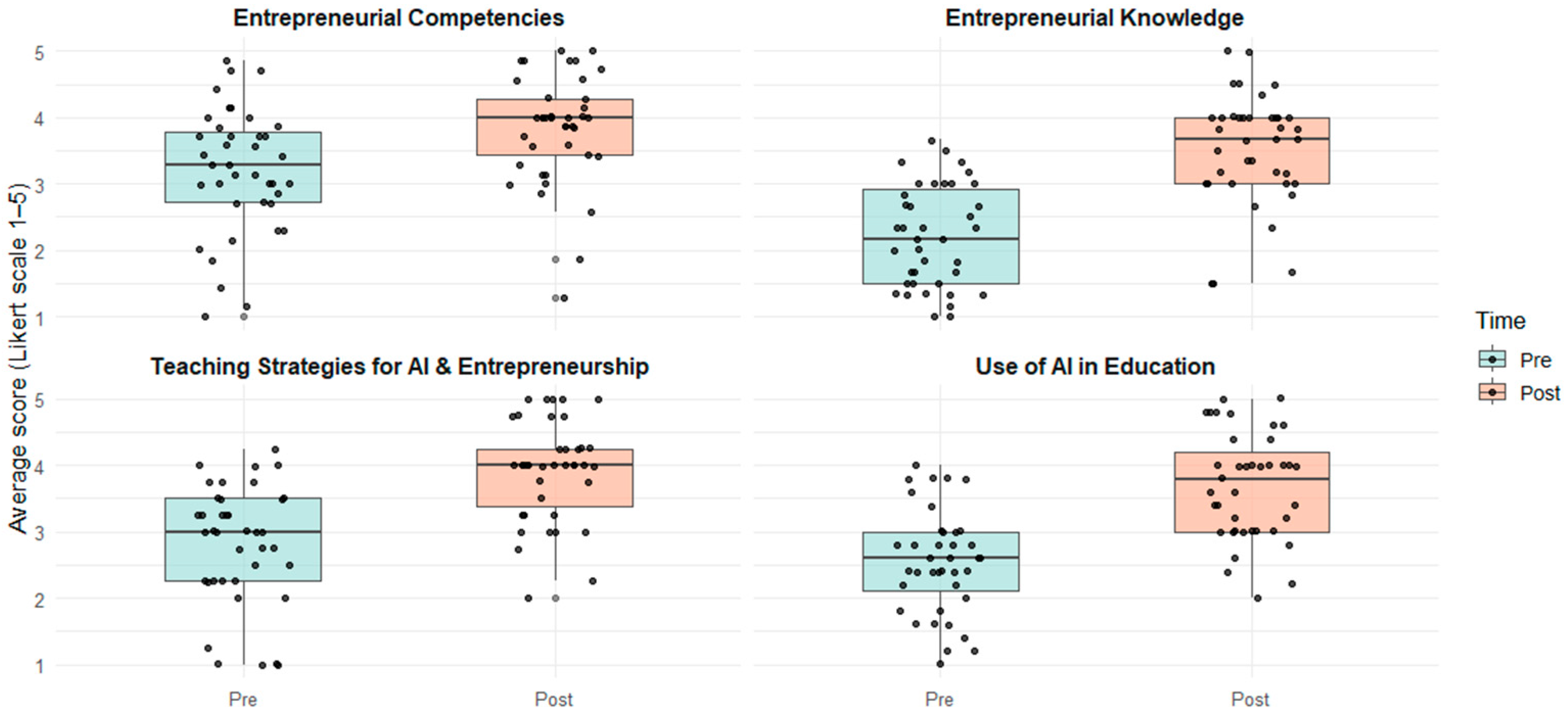 Teaching Strategies for AI & Entrepreneurship | 2.73 ± 0.65 | 3.76 ± 0.58 | <0.001 | <0.001 | 0.76 (high) |