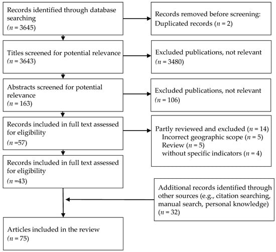 As shown in Figure 1, a total of 3645 records were initially identified through database searches. After removing duplicates, 3643 records remained for screening. Title screening narrowed the selection, excluding 3480 records as irrelevant. The abstracts of the remaining 163 records were reviewed, with 106 further exclusions due to irrelevance. This left 57 records for a full-text eligibility assessment, of which 43 were deemed relevant. Additionally, 32 relevant papers were identified through references from other sources (e.g., citation searching, manual search, personal knowledge), bringing the final count of articles included in the review to 75.