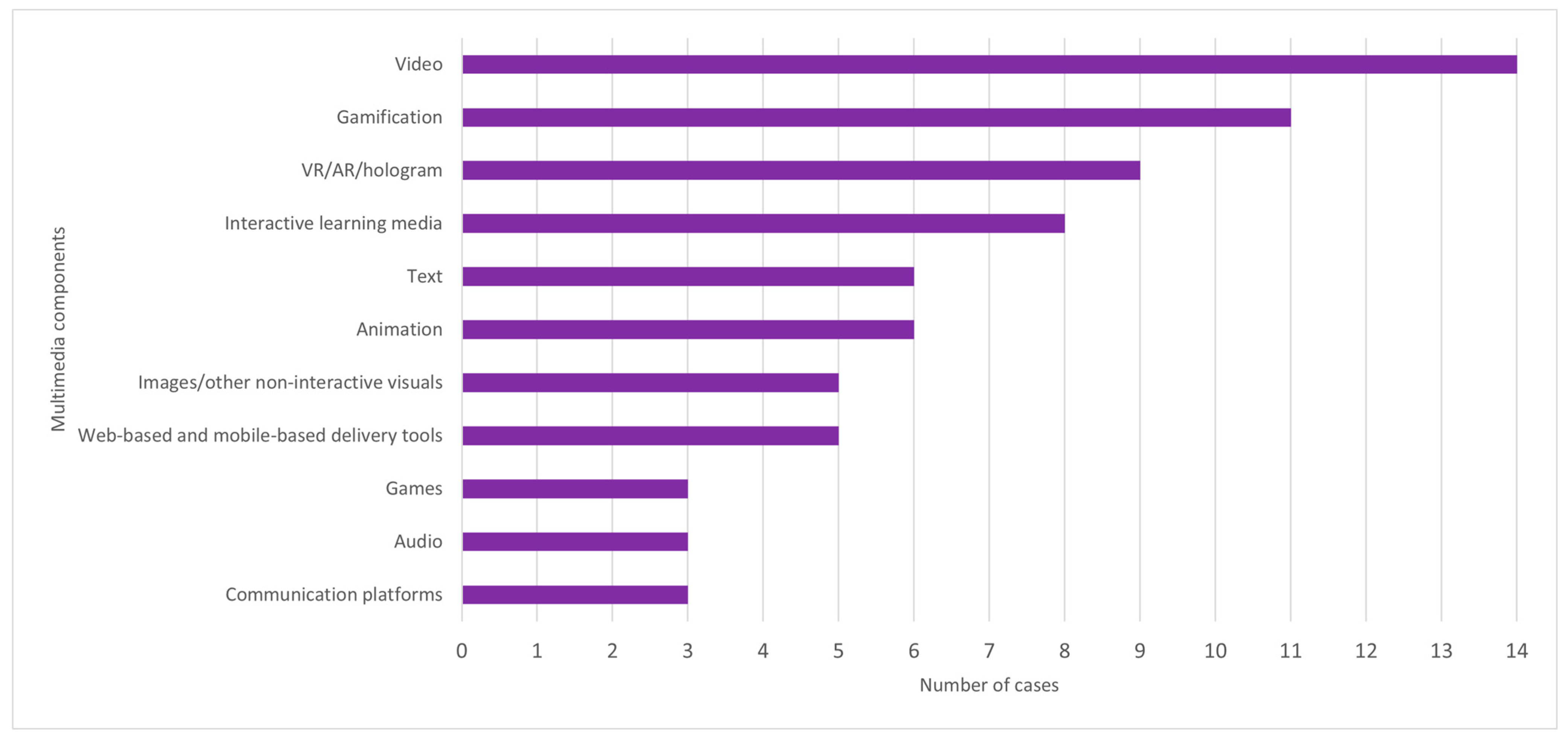 English as a foreign language (EFL) | Games [58]; communication platforms [61]; gamification [41]; interactive learning media [47]; audio [32]; video [32]; text [32]; images/other non-interactive visuals [32] |