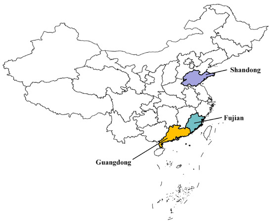 Location map of the study provinces (Fujian, Shandong, and Guangdong) in China.