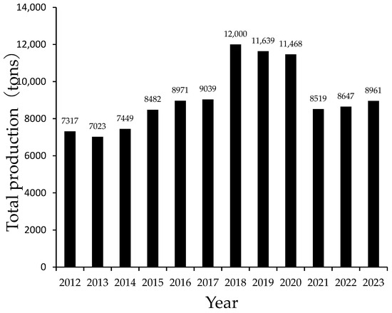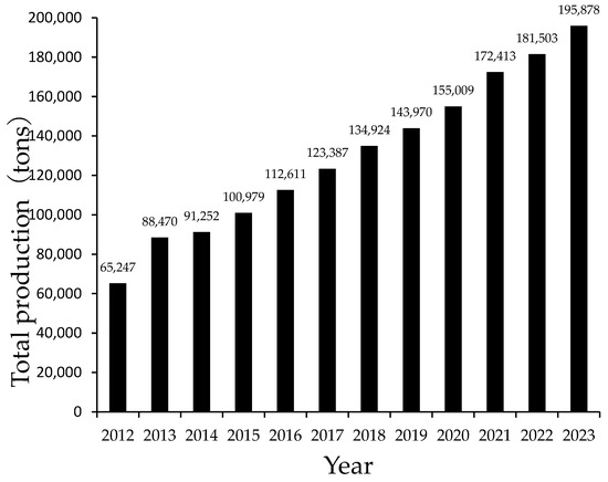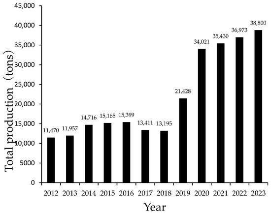 Total abalone production in Guangdong Province from 2012 to 2023.