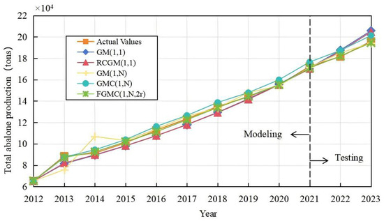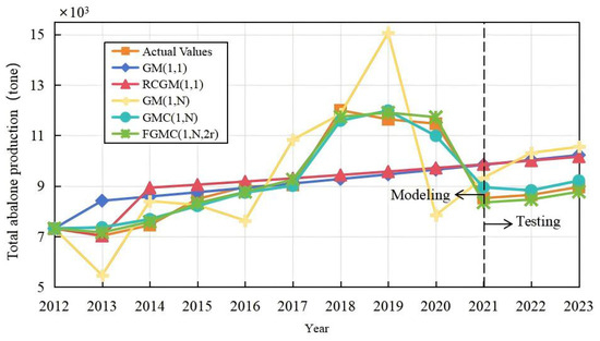 Table 5 presents the modeling and testing results for abalone production in Shandong Province from 2012 to 2023, along with the optimized parameters of various models. During the modeling phase, the FGMC(1,N,2r) model significantly outperformed the other models, achieving a MAPE of 4.46% and an RMSPE of 5.42%. In the testing phase, the FGMC(1,N,2r) model maintained its superiority with a MAPE of 3.51% and an RMSPE of 3.69%. According to these metrics, the FGMC(1,N,2r) model demonstrated superior performance in both phases.