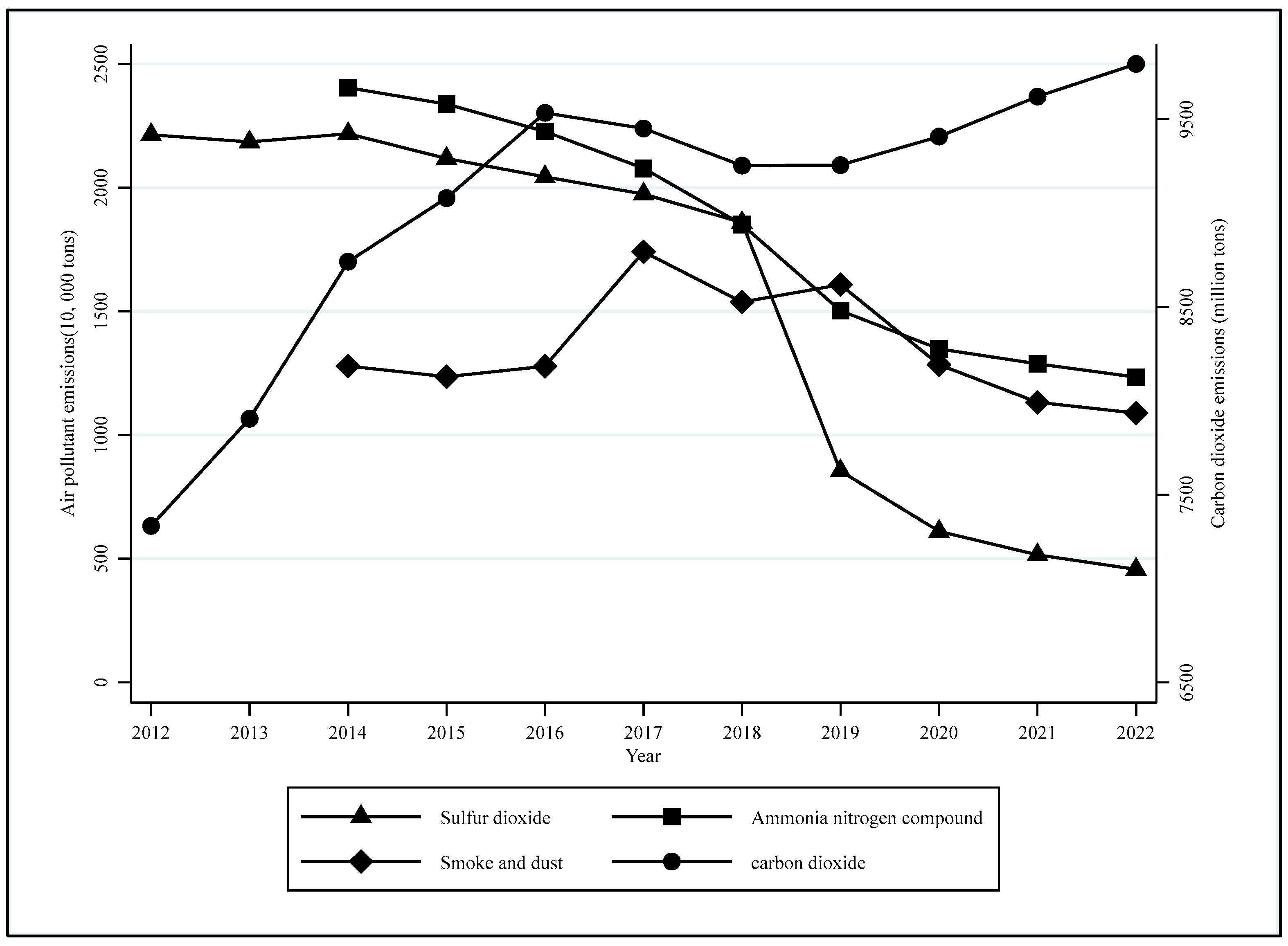 - Zhu, J.; Wu, S.; Xu, J. Synergy between pollution control and carbon reduction: China’s evidence. Energy Econ. 2023, 119, 106541. [Google Scholar] [CrossRef]