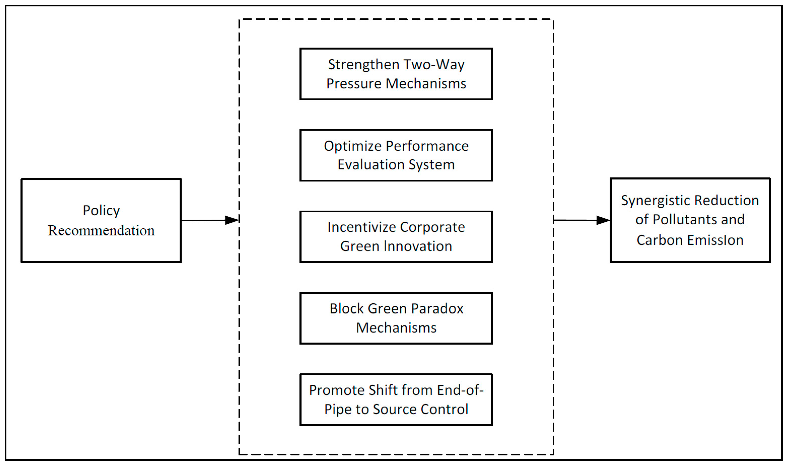 - Local governments need to shift their environmental management philosophy, promoting a transition from end-of-pipe pollution control to source-based prevention. They should be encouraged to establish timetables for phasing out high-carbon industries and formulating plans for clean energy substitution. By establishing green transition funds for industrial restructuring and providing expedited approval processes for low-carbon projects, local governments can reduce the institutional costs of source-based pollution control and enhance their long-term synergistic effects in reducing pollution and carbon emissions. To provide a clearer understanding of the logical connections among the policy implications, Figure 5 illustrates the proposed framework of policy recommendations derived from our findings.