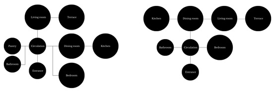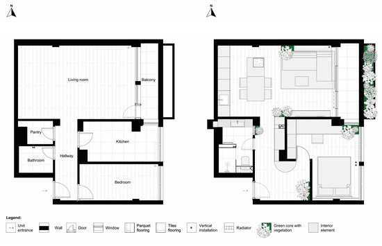 The comparison between the pre-adaption layout (left) and the post-adaption design (right) reveals a shift in the architectural organization of the apartment, demonstrating how the introduction of a green core redefines both spatial logic and environmental performance (Figure 2). In the initial configuration, the plan is structured around conventional compartmentalization: a central hallway distributes access to the pantry, kitchen, bathroom and bedroom while the living room stays as an isolated, large space terminating with a balcony. Circulation is therefore predominantly linear and mono-directional, with a high proportion of space allocated to non-functional corridors. This results in a relatively high wall-to-floor ratio, limited spatial connectivity between functions and restricted access to daylight in inner parts of the apartment. Since the initial height of the apartment was 2.50 m, in order to acquire most of the existing space the sole construction was unveiled, gaining 20 cm of additional height of coffered ceiling impacting height-to-floor ratio. This introduces a dimension of verticality into the compact apartment, reinforcing the perception of spaciousness and improving the indoor microclimate. Additionally, a post-occupancy expert assessment involving five architects confirmed that the refurbishment enhanced both functional and esthetic qualities. The experts rated improvements in spatial connectivity, daylight distribution, contemporary design possibilities and qualities and overall performance corroborating the simulation-based findings and highlighting the tangible architectural benefits of integrating the green core.