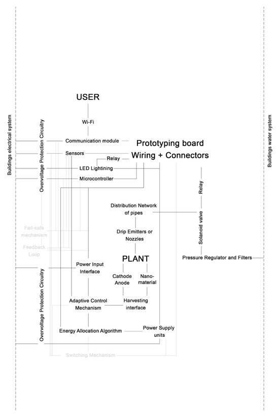 At the heart of the system (Figure 4) lies the plant interface, which serves as both the recipient of resources (light, water, energy) and the central element around which architectural reconfiguration is organized. The system embeds three infrastructural layers directly into the architectural framework: The green core is supported by the building’s electrical network, safeguarded by overvoltage protection circuitry to ensure reliability. Energy is distributed to microcontrollers, LED lighting arrays and sensor networks via power supply units, while adaptive control mechanisms manage allocation. Importantly, the energy allocation algorithm dynamically adjusts consumption, optimizing between plant growth requirements (PAR-specific lighting) and the building’s overall energy performance. This introduces dual benefits: vegetation receives consistent energy inputs for growth, while architectural sustainability is enhanced through controlled demand rather than constant load. By embedding this system, the architecture becomes an active mediator of energy flows, rather than a passive container. On the hydraulic side, the system links directly to the building’s water infrastructure. A pressure regulator and filtration unit condition the incoming supply before it is channeled through solenoid valves and relayed into a distribution network of pipes. These terminate in drip emitters or nozzles positioned within the vegetated core. The design ensures precise, low-volume irrigation, preventing both under- and over-watering by using soil sensors while reducing waste. From an architectural perspective, this distributed piping is embedded into structural elements, transforming the green core into a self-sustaining element of the dwelling rather than a high-maintenance add-on. A network of sensors measures parameters such as soil moisture, air humidity, light intensity and possibly even plant bioelectrical signals. These inputs feed into a microcontroller connected to a prototyping board, which orchestrates system responses via relays. Feedback loops adjust irrigation frequency, light duration and intensity to maintain plant health. The system is Wi-Fi enabled, granting the user real-time access to the occupant not as passive bystander but as an active participant in the ecological processes of the home, fostering awareness of ecological processes and responsibility in daily routines. An energy harvesting interface is implemented, where nanomaterials coupled with cathode-anode systems can capture residual bioelectrical activity generated by plants. While experimental, the mechanism underscores the potential for the green core not only to consume but also to contribute energy back into the system. While the net electrical output generated by plant-based energy harvesting mechanisms is typically small and still in experimental stages, even minor energy contributions can be strategically recycled to support vegetative systems within the core. In this model, the generated power could directly offset the energy required by integrated PAR-specific LED modules, which refers to the light within the 400–700 nm spectrum that plants utilize for photosynthesis, a far more relevant metric than general illuminance measures for human vision. LED arrays engineered for PAR delivery can be spectrally tuned—typically amplifying blue (≈450 nm) and red (≈660 nm) wavelengths—to maximize chlorophyll absorption. Chlorophyll a exhibits absorption peaks near 430 and 642 nm, while chlorophyll b absorbs around 453 and 642 nm; carotenoids complement by absorbing light in the 448–452 nm range [ 16]. Studies in controlled environments have demonstrated that red–blue LED combinations significantly increase photosynthesis rates, leaf biomass, stomatal conductance and in some cases antioxidant activity when calibrated to optimal spectra and intensity levels [21]. Thus, even modest electrical output harvested from living systems [22,23] could sustain the PAR lighting infrastructure, effectively creating a closed-loop ecological–electrical system. This synergy ensures that plant health is supported in energy-neutral ways, reinforcing the green core as both an environmental regulator and an element of sustainable architectural performance.