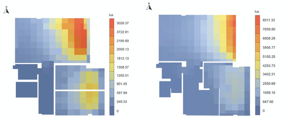 Before and after refurbishment annual lux values heatmap.