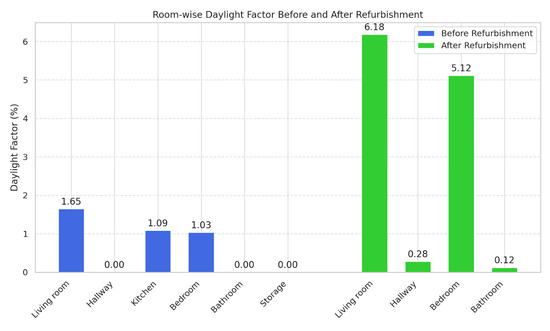The daylight factor (DF), a core metric used to evaluate indoor daylight quality under overcast sky conditions, was analyzed for pre- and after-refurbishment states of the apartment. The result reveals a significant improvement in daylight access across almost all occupied zones after the implementation of the spatial reconfiguration and green core design. In the pre-intervention condition, the living room registered a modest daylight factor of 1.649% while the bedroom and kitchen—key functional zones—remained below 1.1%, indicating potential for improvement. Several internal rooms such as hallway, bathroom and pantry were resulting in 0% daylight factor, confirming the lack of direct or reflected natural light. Following the intervention, the living room values of DF increased to 6.185%, surpassing the EN 17037 daylight threshold for primary habitable spaces. The bedroom reached 5.117%, indicating a strong enhancement in natural illumination. Even the hallway and bathroom, previously devoid of daylight, now registered measurable values of 0.28% and 0.12%, respectively—suggesting the efficacy of spatial openings and the secondary light diffusion introduced through the green core strategy. Notably, while the kitchen space was repositioned and thus not directly comparable, the daylight gains in adjacent zones serve as a proxy for improved environmental quality. These outcomes validate the hypothesis that architectural reconfiguration and the incorporation of central green cores can significantly enhance daylight performance in compact urban environments, with the added benefit of promoting spatial equity in light distribution. The comparative graph (Figure 6) visually communicates this transformation, reinforcing the performance-based value of the intervention and aligning the daylighting strategy with European daylight standards (EN 17037) and WELL v2 biophilic performance benchmarks.