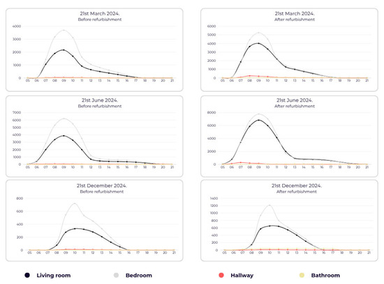 To capture the temporal variation in daylight availability, point-in-time illuminance simulations were conducted in DIALux for three representative seasonal dates—21 March (Equinox), 21 June (Summer Solstice) and 21 December (Winter Solstice)—spanning the full daylight hours from 05:00 to 21:00. (Figure 7) This approach allowed assessment of daylight behavior under both average and extreme solar conditions. As shown in the diurnal lux distribution graphs, daylight levels in the living room and bedroom experienced a pronounced increase post-refurbishment, particularly during peak daylight hours for the east orientation (08:00–12:00). For the summer solstice, maximum illuminance in the living room rose from approximately 3500 lux to over 6500 lux, while in winter gains exceeded 500 lux—more than doubling the pre-intervention performance. The hallway and bathroom, previously unlit zones, registered marginal but significant gains due to strategic introduction of green zones, reflective surfaces and internal light redistribution. These daylight gains indicate not only an improved visual environment but also enhanced passive solar performance and potential reductions in other metrics. The curves also reflect better light distribution throughout the day, suggesting reduced overexposure peaks and more sustained availability—contributing to overall visual comfort and compliance potential with EN 17037 daylight recommendations. This diurnal profile comparison strengthens the argument for spatial reorganization (Table 6) in favor of daylight-accessible and vegetation-integrated layouts.