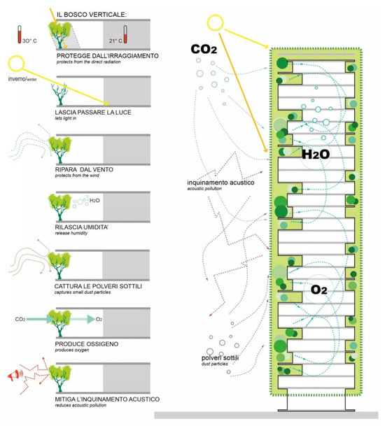 Sectional schematic of the Bosco Verticale towers in Milan, illustrating how vegetation functions as a microclimatic buffer [27].
