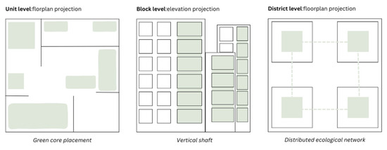 At the urban scale, the aggregation of green cores across multiple units suggests the potential to establish vertically and horizontally continuous ecological infrastructures. When stacked within multi-story housing blocks, green cores can align into ecological shafts that enable distributed ventilation, collective rainwater-fed irrigation, or shared hydroponic systems. This not only amplifies environmental performance but also enhances biodiversity connectivity within otherwise impermeable housing fabrics [29]. For instance, in Singapore’s Pinnacle@Duxton housing development, vertical greenery has been aggregated across sky gardens to create distributed ecological corridors at the block scale, aggregating into a network of vertical and horizontal eco-links. Green cores offer a similar but more gradual model: one that begins at the unit level and aggregates upwards, allowing distributed micro-systems to function collectively as block-scale ecological networks. What differentiates this model from Pinnacle@Duxton is bottom-up scalability: the ecological network does not require monumental, shared sky gardens but emerges incrementally from each unit’s green core. By linking micro- to macro-scales (Figure 10), cores can transform housing blocks into performative metabolisms, supporting both human wellbeing and non-human ecological processes.