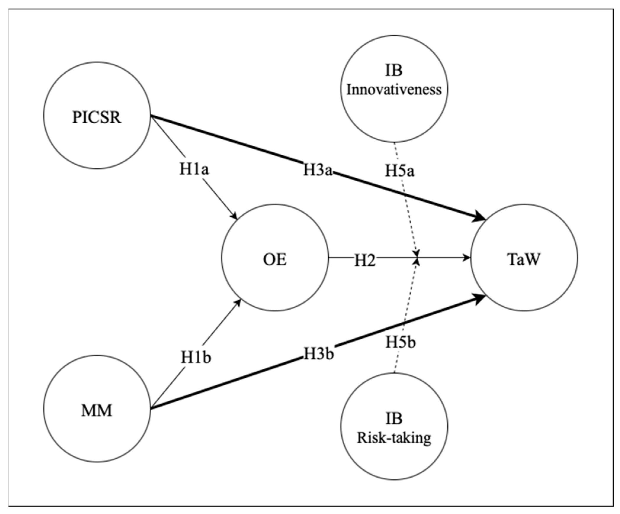 In addition to the direct effects of PICSR and OE on TaW, IB may moderate the strength of these relationships, particularly through risk-taking and innovativeness. Pinchot [