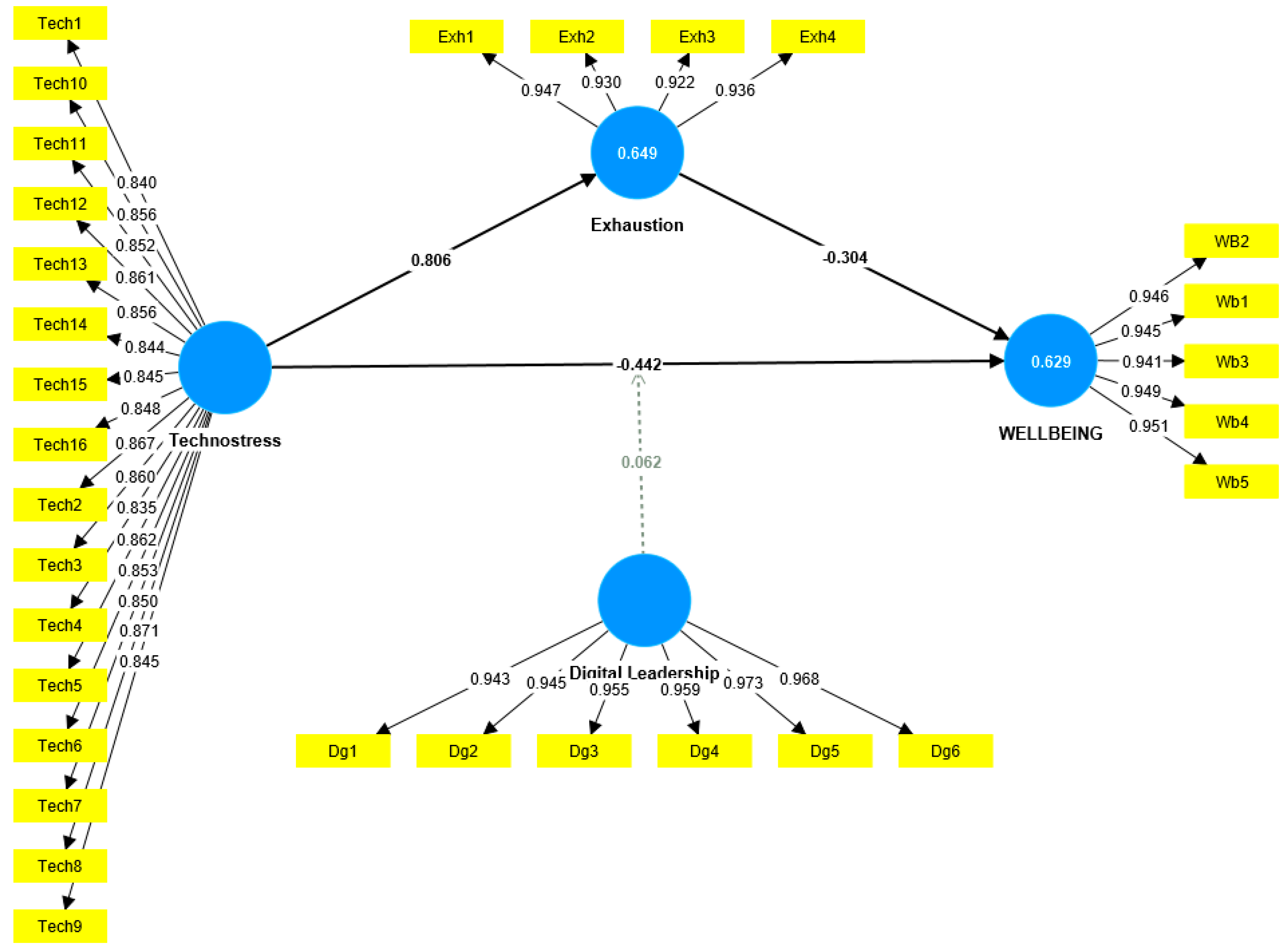 Digital Leadership | Exhaustion | Technostress | Well-Being | Digital Leadership × Technostress | |