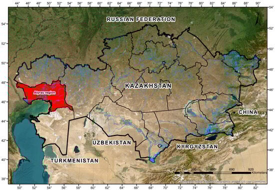 Study area: Atyrau Region, Kazakhstan. Source: compiled by the authors based on data from ESRI, Maxar Technologies, Earthstar Geographics, and the GIS User Community.