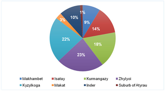 Structure of pasture land distribution by districts of the Atyrau region. Source: compiled by the authors based on land use analysis and data from the Atyrau Regional Department of Agriculture for 2023.