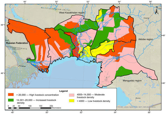 For the quantitative assessment of anthropogenic pressure on pasture lands in the Atyrau region, the Pasture Load Index (PLi) was calculated based on the integration of data on the number of agricultural animals converted to livestock units and the indicators of pasture forage capacity at the level of rural districts. Agricultural statistics data were aggregated at the district level with subsequent calculation of the weighted average PLi, which allowed obtaining a picture of the spatial differentiation of pressure on natural pasture resources [61].