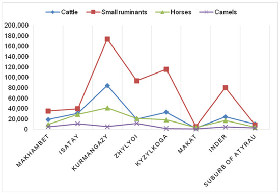 The analysis of the spatial structure of pasture lands revealed a pronounced territorial differentiation within the Atyrau region (Figure 3).