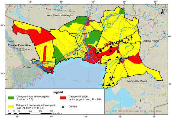- Tokbergenova, A.; Skorintseva, I.; Ryskeldiyeva, A.; Kaliyeva, D.; Salmurzauly, R.; Mussagaliyeva, A. Assessment of Anthropogenic Disturbances of Landscapes: West Kazakhstan Region. Sustainability 2025, 17, 573. [Google Scholar] [CrossRef]