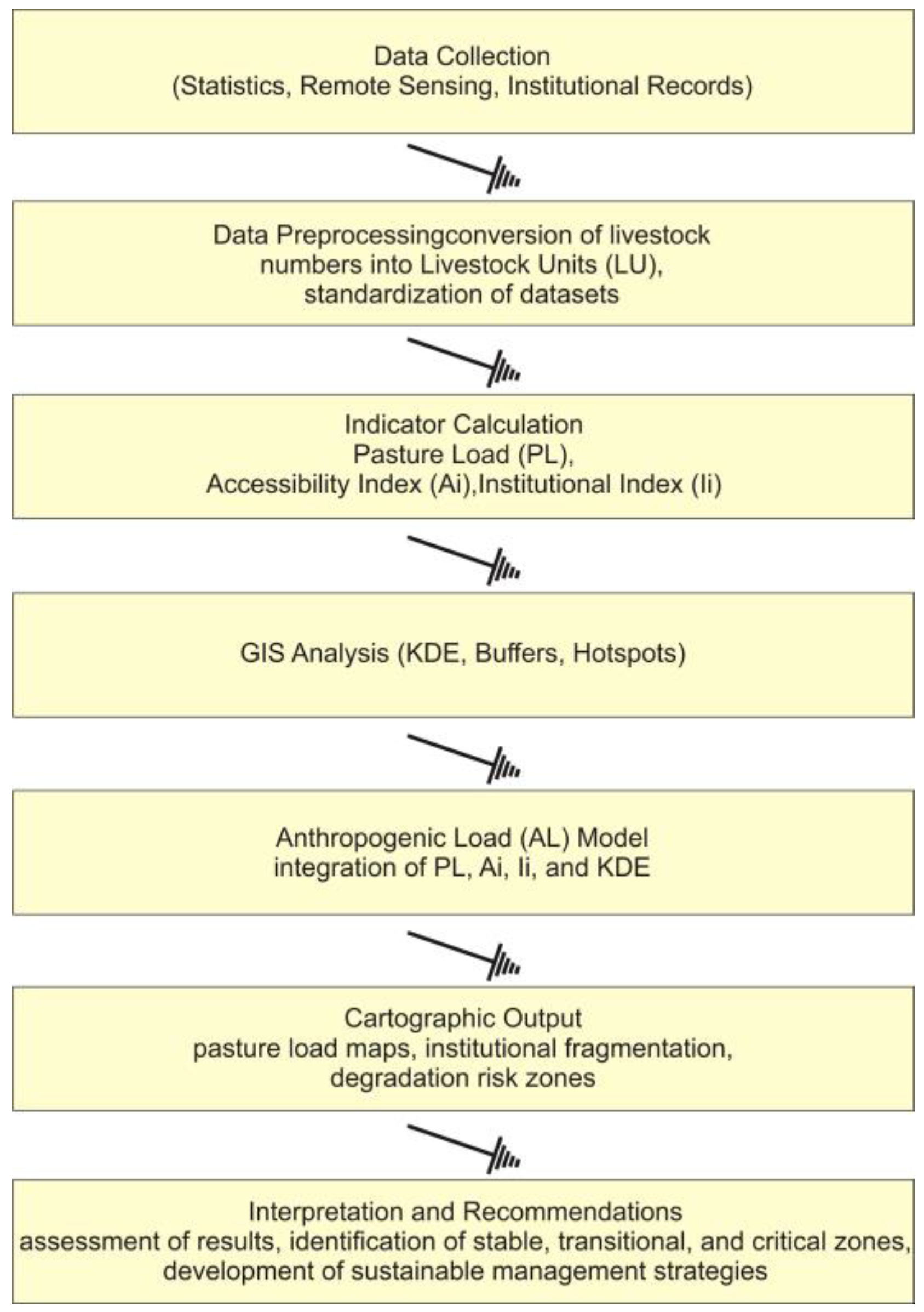 The purpose of this study is to address the identified research gap. Its objective is to conduct an integrated spatio-temporal assessment of pasture degradation processes under the arid climatic conditions of the Atyrau Region, based on the development and testing of an Anthropogenic Load (AL) model. Unlike previous approaches, this model integrates: (1) the calculation of pasture load using agricultural statistics for 2023; (2) geospatial analysis of grazing concentration through Kernel Density Estimation; (3) assessment of pasture infrastructural accessibility (Accessibility Index, Ai); and (4) institutional diagnostics of land use organization (Institutional Index, Ii). The combination of these components enables the identification not only of spatial “hot spots” of degradation but also of management and institutional dysfunctions that affect ecosystem sustainability.