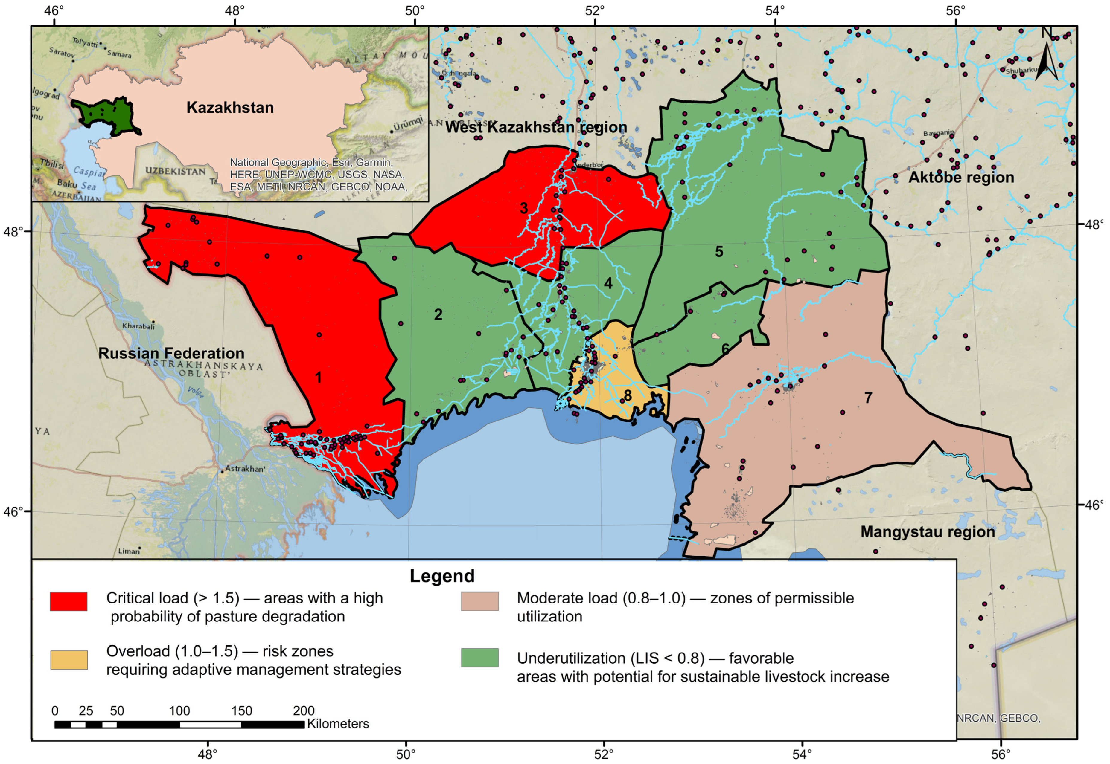 The integrated assessment of pasture load under the arid conditions of the Atyrau region revealed pronounced territorial differences in the degree of anthropogenic pressure on ecosystems, determined not only by livestock numbers but also by the spatial accessibility of pastures, water availability, and the institutional organization of land use. The obtained results allow for the following applied and strategically oriented conclusions: