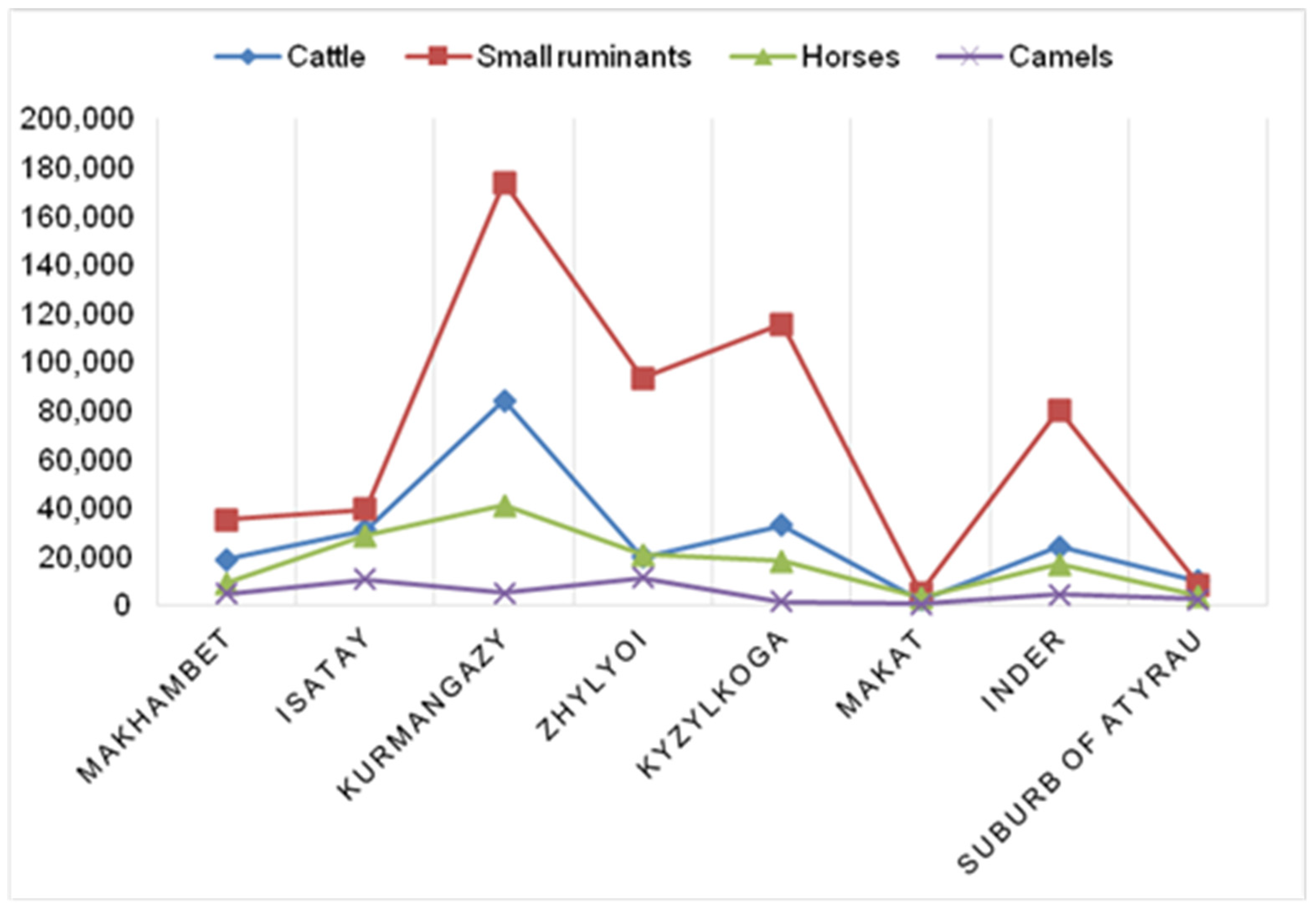 Livestock numbers in the Makat district are characterized by relatively low values, which allows classifying the territory among regions with moderate pasture load. At the same time, the district is located in an active oil production zone, which causes substantial technogenic impact on the natural environment. Moreover, the predominance of saline soils and unfavorable agroecological conditions significantly limit the possibilities for livestock development, reducing the forage capacity of lands and increasing the risk of degradation of pasture ecosystems.