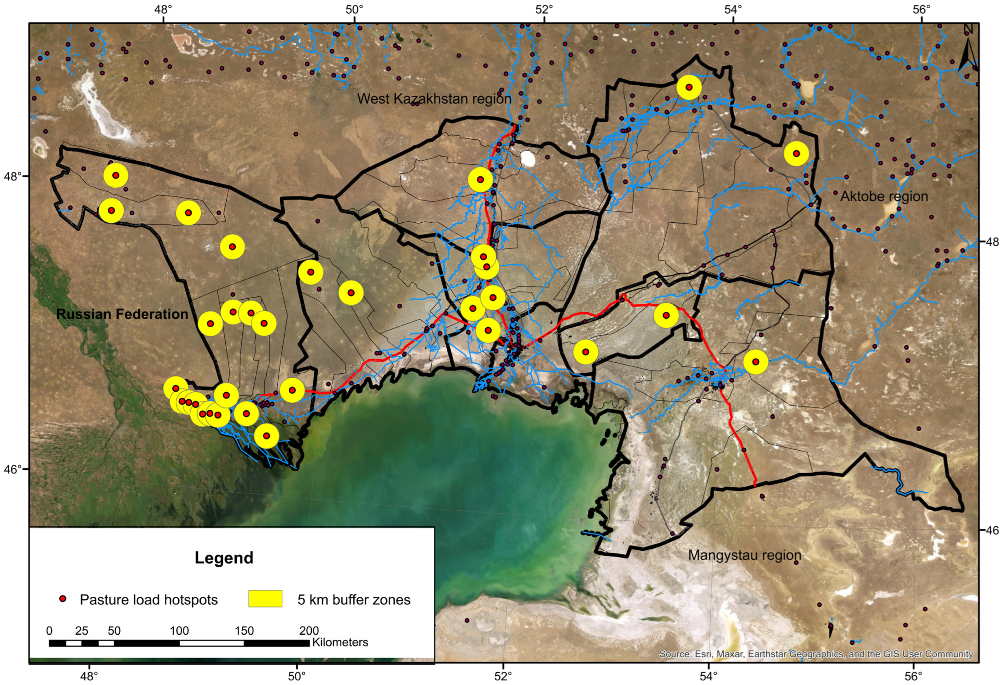 Regional studies confirm that pasture degradation in the Atyrau Region is caused not only by biophysical and climatic factors but also by increasing anthropogenic pressure, primarily from extractive industries. This highlights the relevance of integrative approaches capable of combining GIS analysis, remote sensing, regulatory calculations of pasture load, and the assessment of technogenic impacts within a unified methodological platform for sustainable pasture management.