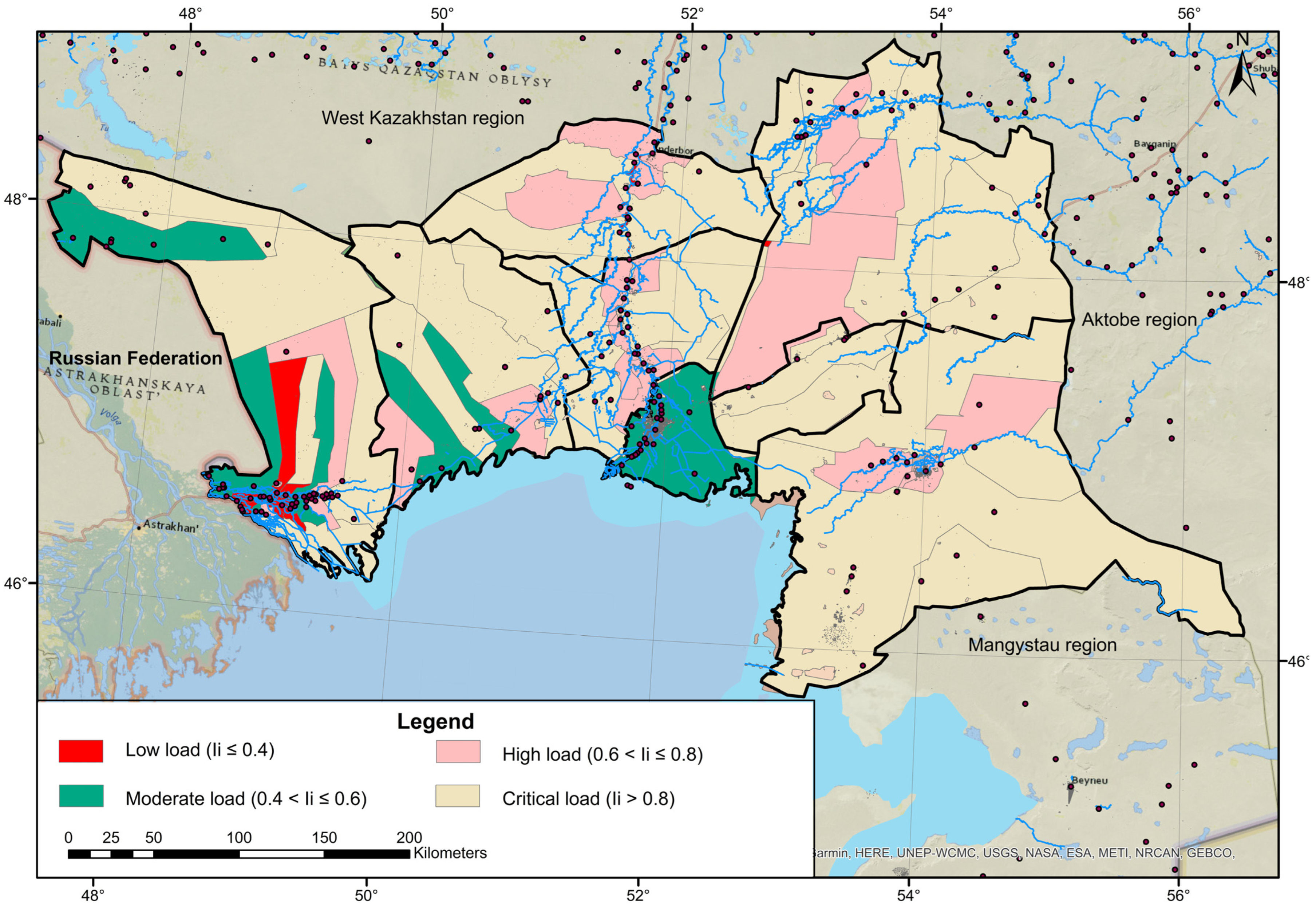 High load, AL > 0.6 (III) constitutes critically vulnerable areas where four degradation factors combine: exceeding permissible pasture load, spatial hyper-concentration of livestock, remoteness from water sources, and absence of legal regulation of land use. These areas are identified near settlements (Atyrau, Inder, Kyzylkoga), where pasture rotation is absent, and the pressure on pastures reaches critical levels. These zones experience vegetation cover exhaustion, formation of persistent erosion hotspots, overgrowth with inedible species, and a sharp decline in biodiversity.
