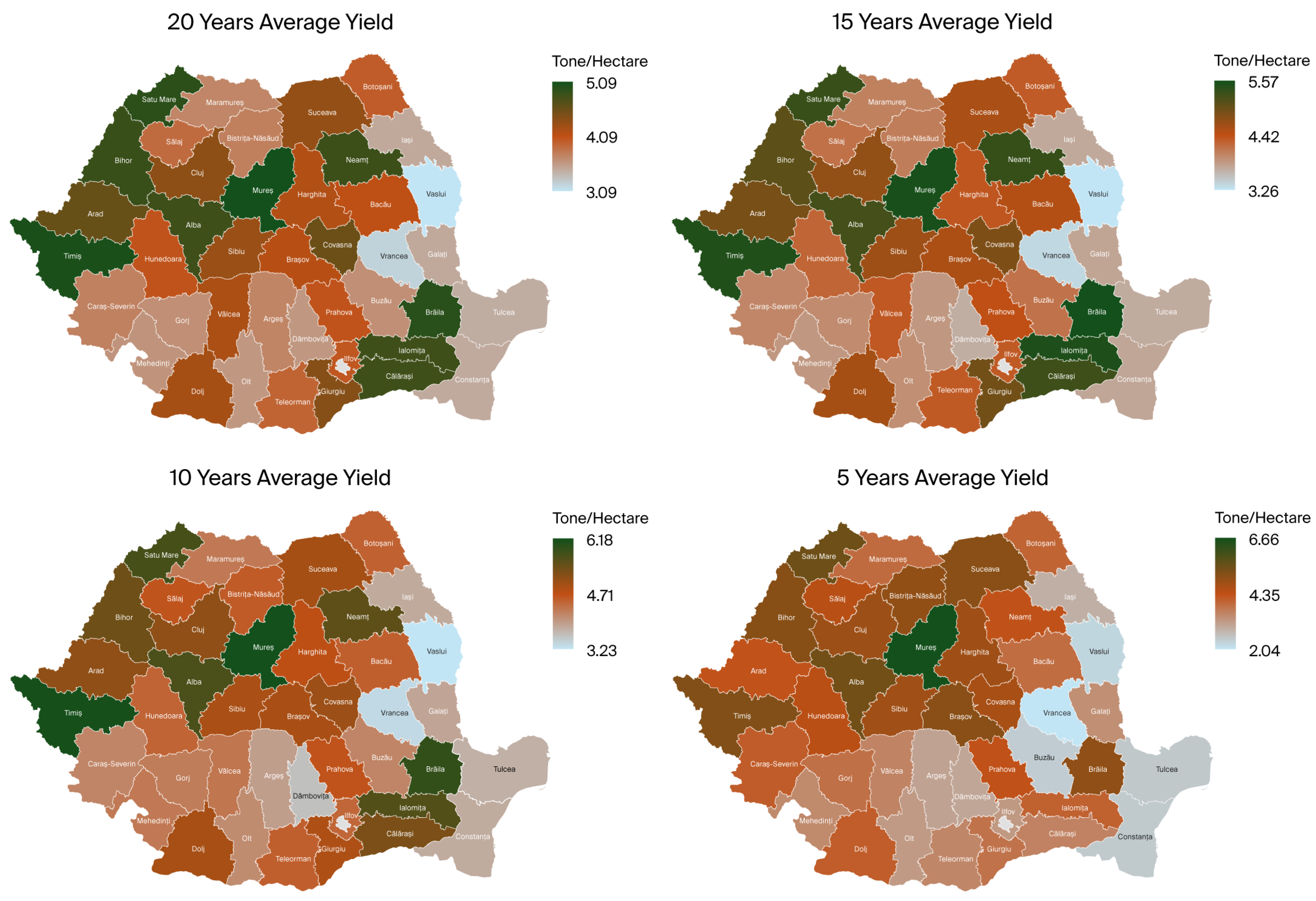 In order to evaluate the dynamics of agricultural production in Romania, a quantitative analysis based on annual data series at the county level is essential. In the case of maize county level, average yield data from the past two decades provide a clear picture of the transformations that have occurred in the agricultural sector. By calculating averages over 20-, 15-, 10-, and 5-year periods, we can observe not only the general trends, but also the level of volatility and regional differentiation (see Figure 1).