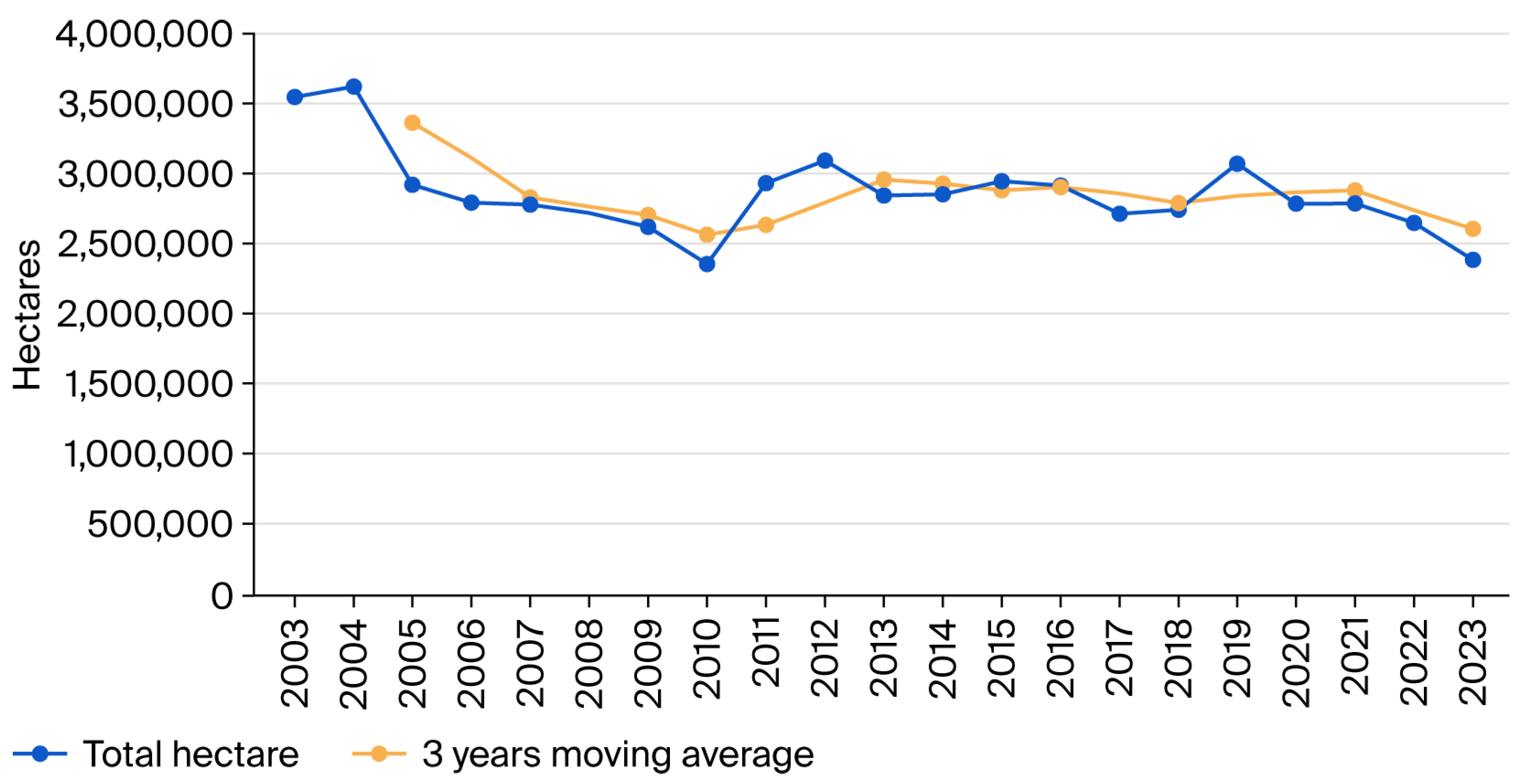 Based on the results, comparative graphs were developed between the annually cultivated area and the 3-year moving average, at the national level, to highlight periods of expansion or contraction of cultivated areas and their correlation with periods of severe drought.