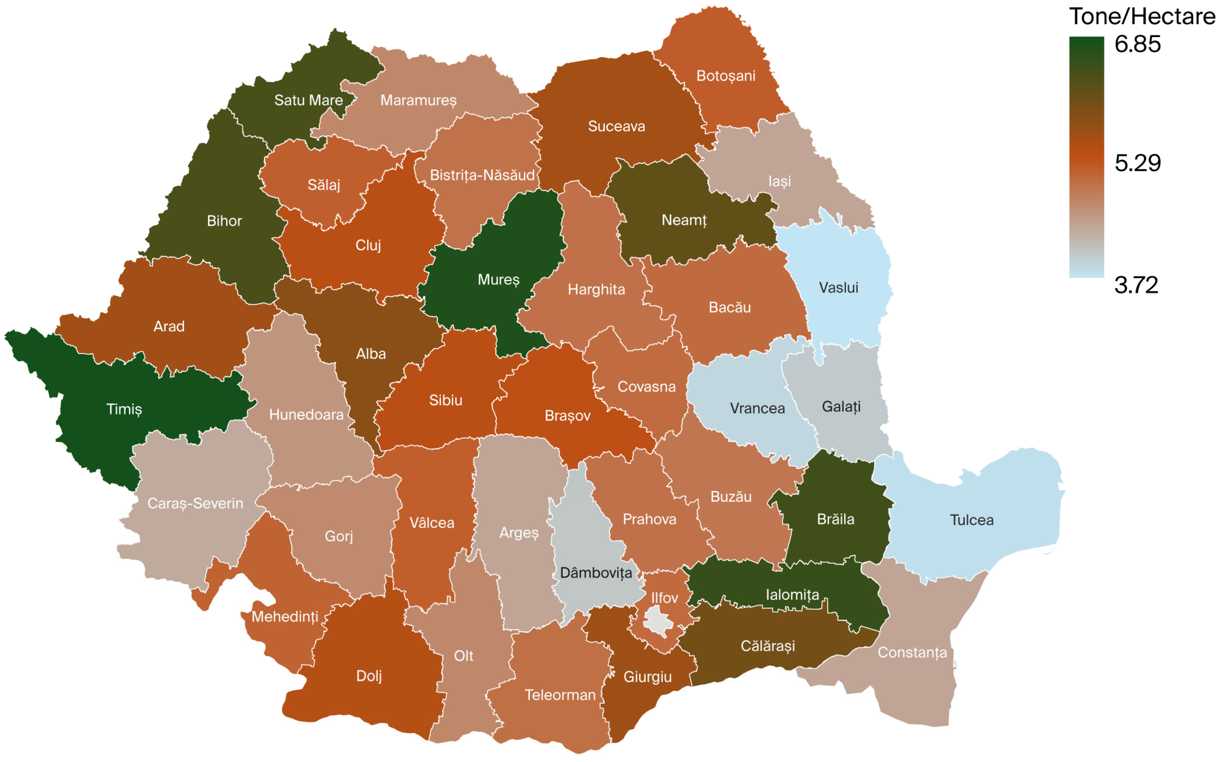 In the last few years, an increased frequency of severe droughts and heatwaves was recorded. The impact was severe because it happened during the critical growth period of the maize crops. The most affected years were 2020 and 2022. The effects were particularly visible in the southern and south-eastern regions. These regions are also highly exposed to water stress. These extreme weather conditions significantly reduced yields despite technological progress. Very important these extreme events combined with a low infrastructure in Romania from the irrigation perspective explain why the upward trend observed until 2015 could not be sustained, resulting in a marked downturn in yields in recent years. This upward evolution, followed by a downturn, is consistent with agricultural dynamics observed across Europe, where partial modernization of agricultural technologies led to higher yields, but the increasing frequency of extreme climate events has offset some of these gains in recent years [31].