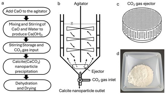 (a) Process flow diagram illustrating the CaO/Ca(OH)2-based CO2 mineralization system; (b) schematic illustration of the carbonation reactor assembly; (c) close-up view of the CO2 ejector used to enhance gas–liquid mass transfer efficiency and ensure uniform dispersion of CO2 within the slurry, thereby promoting consistent nucleation and particle growth; (d) image of the final calcite nanoparticle product.