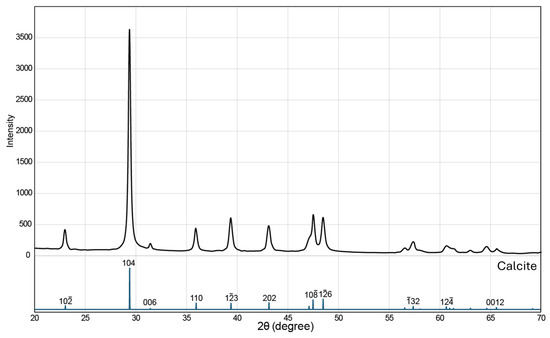 XRD analysis was conducted to examine the phase composition, crystallinity, and structural characteristics of the synthesized calcium carbonate byproduct, with the objective of confirming the formation of the calcite polymorph. The diffraction pattern exhibited a series of sharp and intense peaks, characteristic of a well-ordered crystalline material (Figure 2). Peak positions and relative intensities showed complete agreement with reference data [14,15] for rhombohedral calcite (space group Rc). Prominent reflections, including the (10), (104), (110), (13), and (202) planes, were consistent with the standard pattern, indicating the exclusive presence of calcite. No diffraction signals attributable to alternative CaCO3 polymorphs, such as aragonite or vaterite, were detected, confirming the high phase purity of the synthesized product. The nanocrystalline nature of the calcite was further confirmed by estimating the average crystallite size using the Scherrer Equation (3), applied to the full width at half maximum of the dominant reflections.
