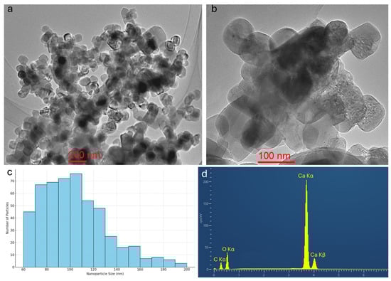 (a,b) Representative bright-field TEM images of the synthesized calcite nanoparticles, clearly exhibiting discrete particles with well-defined rhombohedral morphology; (c) particle size distribution histogram derived from measurements of 536 individual nanoparticles, showing a unimodal but positively skewed profile with the majority of particles falling in the 70–110 nm range; (d) EDS spectrum of the nanoparticles, revealing only calcium, carbon, and oxygen peaks, confirming high chemical purity with no detectable elemental impurities.