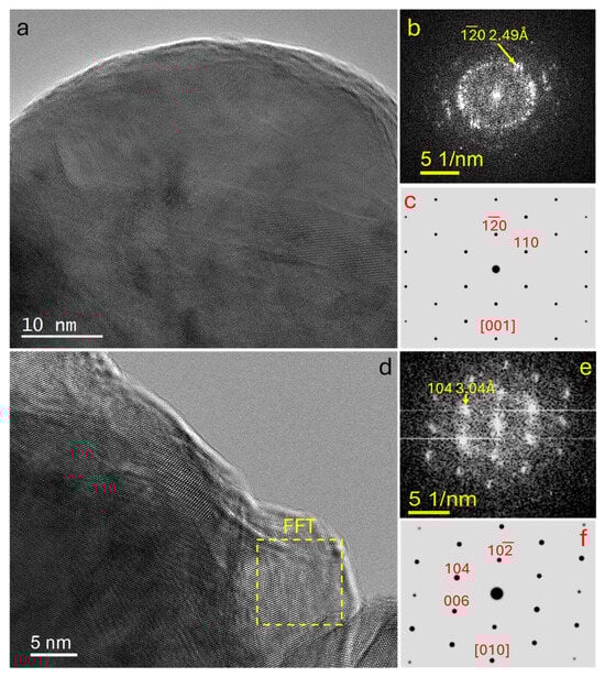 (a) HRTEM image of an individual nanocrystalline grain within a calcite nanoparticle, showing well-resolved lattice fringes; (b) corresponding FFT pattern of the entire grain; (c) simulated electron diffraction pattern of calcite viewed along the [001]-zone axis for comparison; (d) HRTEM image of another nanocrystalline domain within a different particle; (e) selected-area FFT pattern (yellow dash region) extracted from the domain in (d); (f) simulated calcite electron diffraction pattern corresponding to the crystallographic orientation observed in (e).