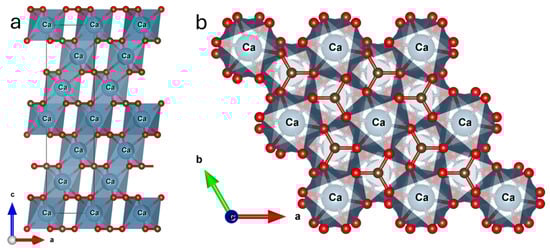 Illustration of the calcite crystal structure viewed along (a) the b-axis and (b) the c-axis. The blue circles represent Ca atoms; Brown spheres represent carbon atoms, and red spheres represent oxygen atoms, highlighting the arrangement of carbonate groups within the rhombohedral lattice.