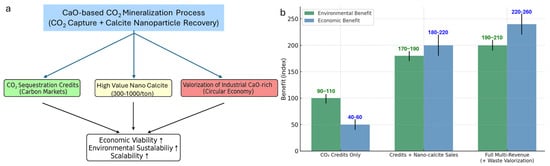 (a) Schematic representation of the integrated multi-revenue model for CaO/Ca(OH)2-based CO2 mineralization, illustrating three synergistic revenue streams. The integration of these streams enhances economic viability, environmental sustainability, and scalability. (b) Comparative assessment of environmental (green bars) and economic (blue bars) benefits for different revenue models, expressed as relative benefit indices with error ranges. Models include CO2 credits only, credits combined with calcite nanoparticle sales, and the full multi-revenue approach incorporating waste valorization. Error bars indicate estimated benefit variability based on market and operational uncertainties.