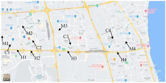 This study was conducted in Kuwait, located in the northeastern Arabian Peninsula and has a population of approximately 4.43 million people [27], with an estimated 2.3 million registered vehicles [28]. In urban areas, the transportation sector is widely regarded as the primary source of environmental noise pollution. To conduct the noise monitoring component of this study, appropriate sites were identified based on the road network illustrated in Figure 1. Four residential neighborhoods were selected to represent a diverse cross-section of urban environments in Kuwait: Ishbiliya, Al Farwaniyah, Zahra, and Mishref. As summarized in Table 1, these neighborhoods were chosen to capture variations in land use, traffic intensity, and road infrastructure.