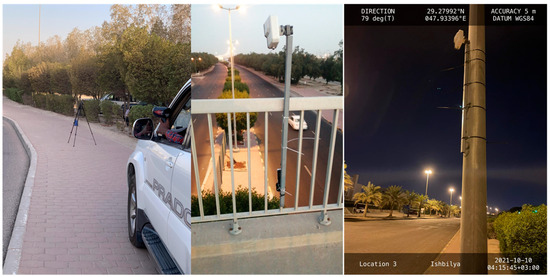 We carried out monitoring in two daily periods, from 5:00–9:00 in the morning and 13:00–15:00 at midday. After each run, the data were collected and the same procedure was applied at every site to keep results comparable. Figure 2 gives examples of the setups.