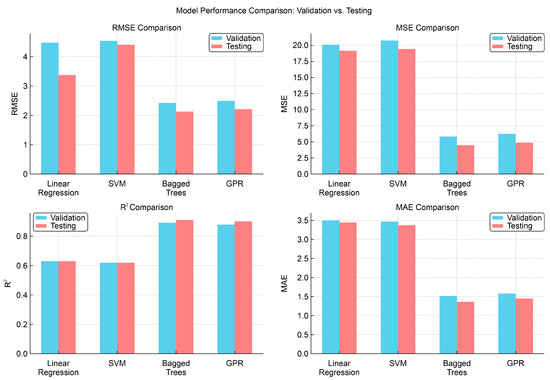 Gaussian Process Regression (GPR) followed closely, showing solid performance with validation RMSE and MAE of 2.49 and 1.59, respectively, and an R2 of 0.88. On the testing set, GPR maintained competitive results (RMSE = 2.22, R2 = 0.90), making it a viable option for applications that also require predictive uncertainty estimates.