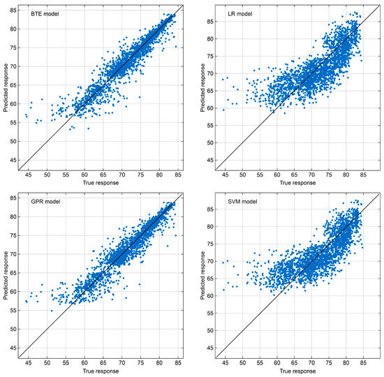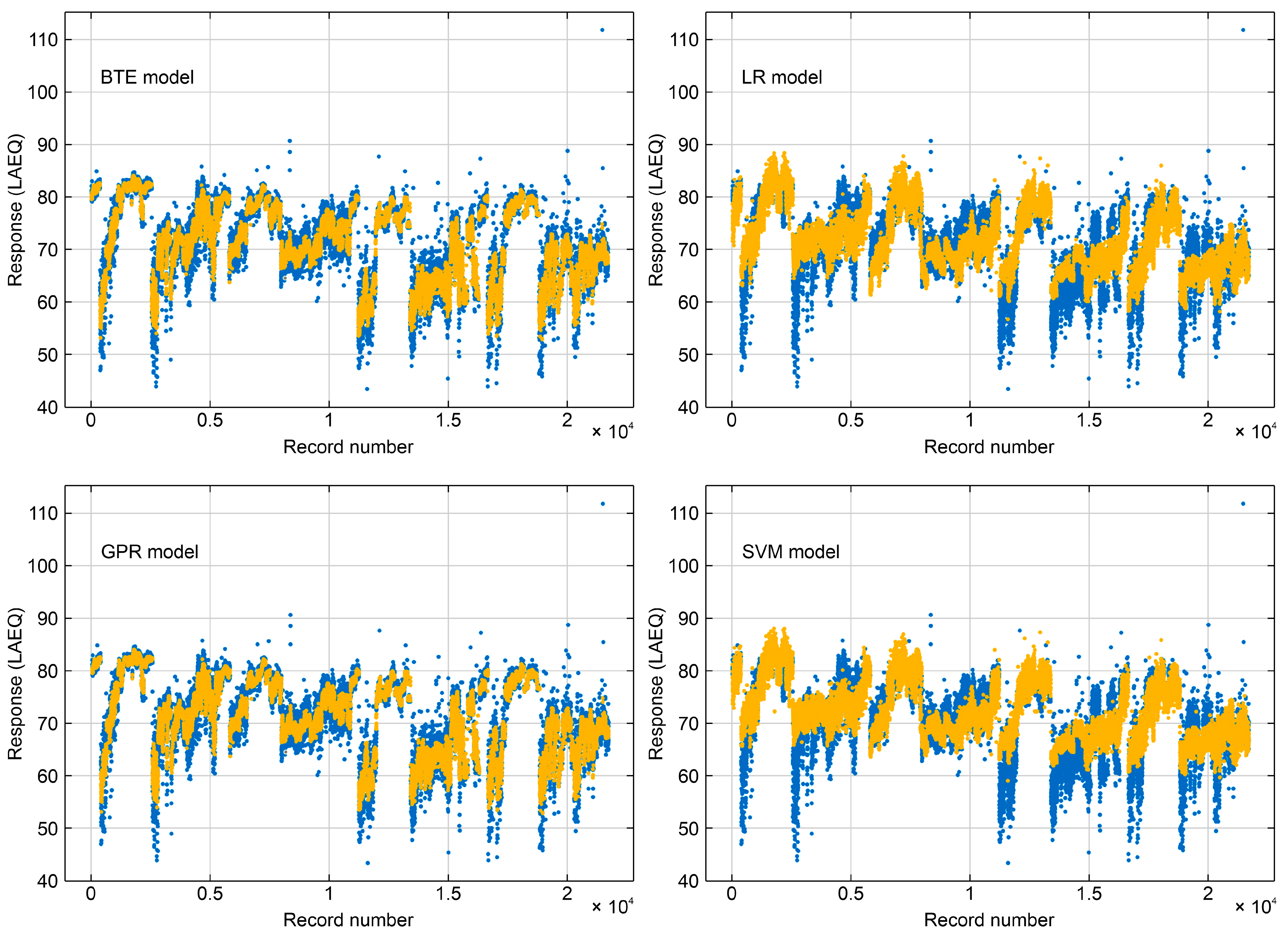 Overall, these results highlight the superiority of ensemble learning techniques, particularly Bagged Trees, for modeling urban traffic noise. BTE’s ability to handle nonlinear interactions, heterogeneous input features, and measurement variability made it the most accurate and robust model in this study. GPR also showed promise, especially where interpretability and uncertainty quantification are prioritized. The relatively poor performance of LR and SVM further underscores the importance of using advanced nonlinear models in traffic noise prediction contexts.