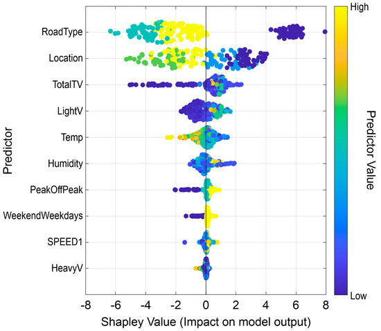 In this study, SHAP was applied to the Bagged Trees model using the TreeExplainer algorithm, which is optimized for tree-based ensemble methods. This enabled the efficient computation of exact SHAP values, addressing the limitations associated with approximate approaches that may be less accurate or computationally intensive. The analysis evaluated the influence of eleven input variables, including spatial, temporal, environmental, and traffic-related factors, on the predicted LAeq values.