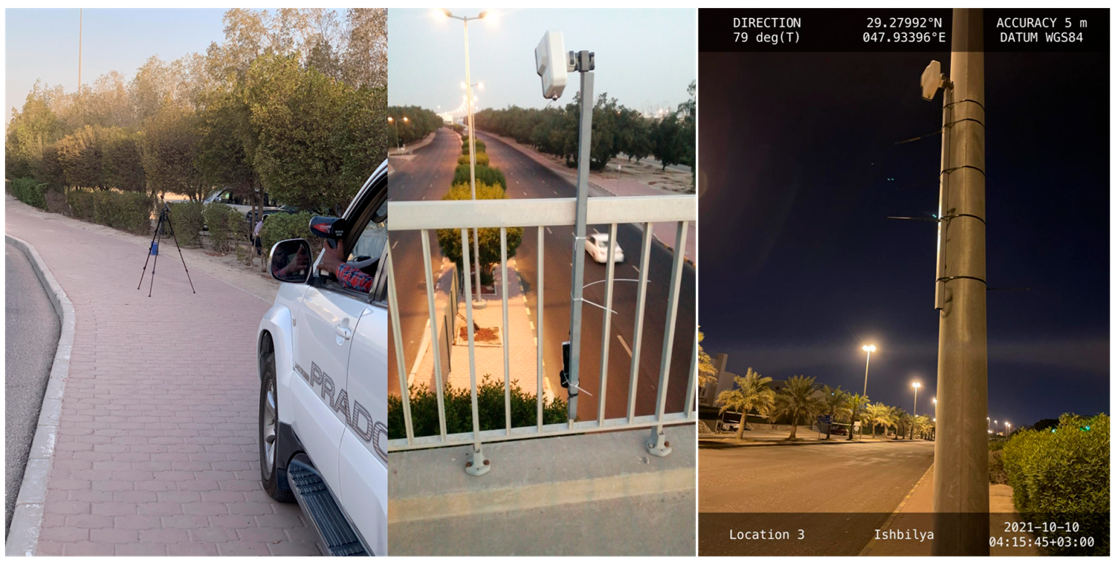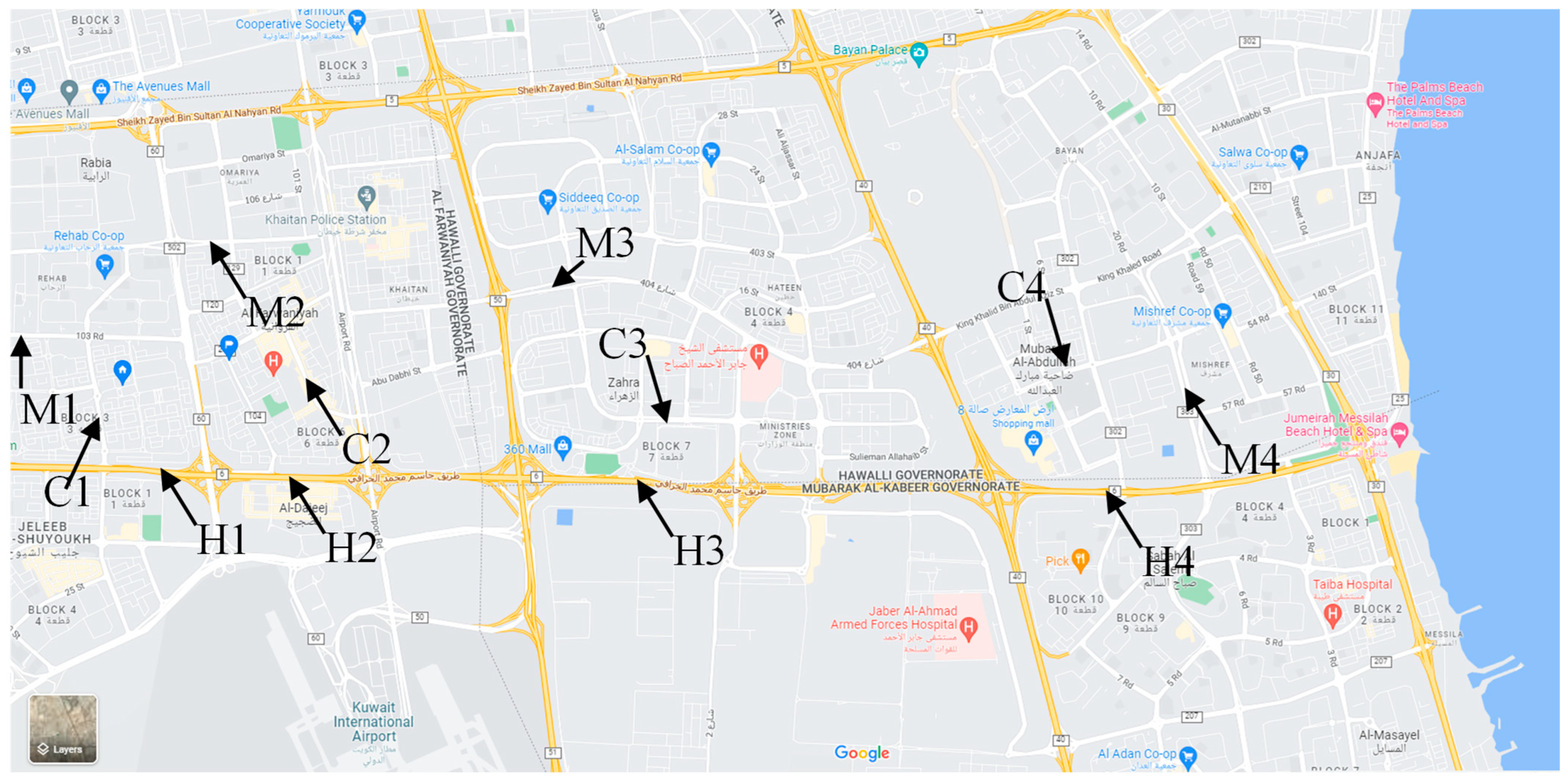 The monitoring operation involved several sites located in four urban neighbourhoods in Kuwait. The sites were selected to reflect traffic-related noise pollution in urban settings; two of them were near Kuwait International Airport and the other two were situated further away. Each site featured distinct land uses, ranging from residential to commercial areas. The monitoring operations were conducted over five days to represent one weekday of each of the four seasons and one weekend day per neighborhood. These monitoring operations took place between October 2021 and August 2022.