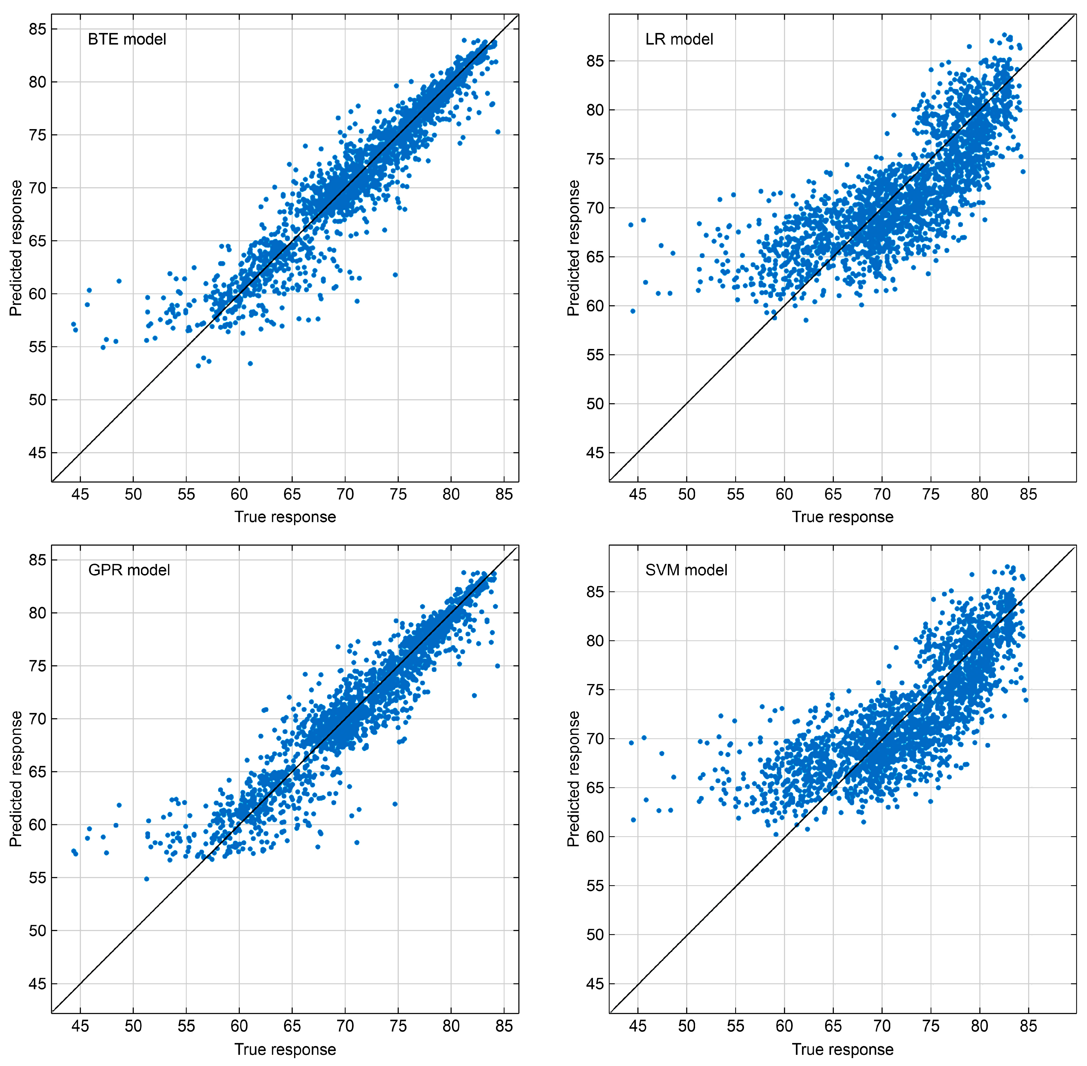 Table 3. In the inner loop, candidate hyperparameter sets were explored through grid search for the SVM and GPR models, and through random subspace sampling for the Bagged Trees Ensemble, while the outer loop provided unbiased estimates of generalization performance. For the SVM, box constraint (C), kernel scale (γ), and epsilon (ε) were tuned within predefined ranges, with the optimal configuration minimizing RMSE. For the GPR, different kernel functions (squared exponential, rational quadratic, and Matern) were evaluated, and the rational quadratic kernel was selected for its balance between accuracy and efficiency. For the Bagged Trees Ensemble, the number of learners and minimum leaf size were varied, with optimal performance achieved at 30 learners and a leaf size of 8. Linear Regression required no tuning beyond standardization. All hyperparameters were fixed to their optimal values during final training, and models were retrained on the full dataset before test set evaluation. All analyses were conducted in MATLAB R2024b which provided built-in functions for model training, hyperparameter optimization, and cross-validation.