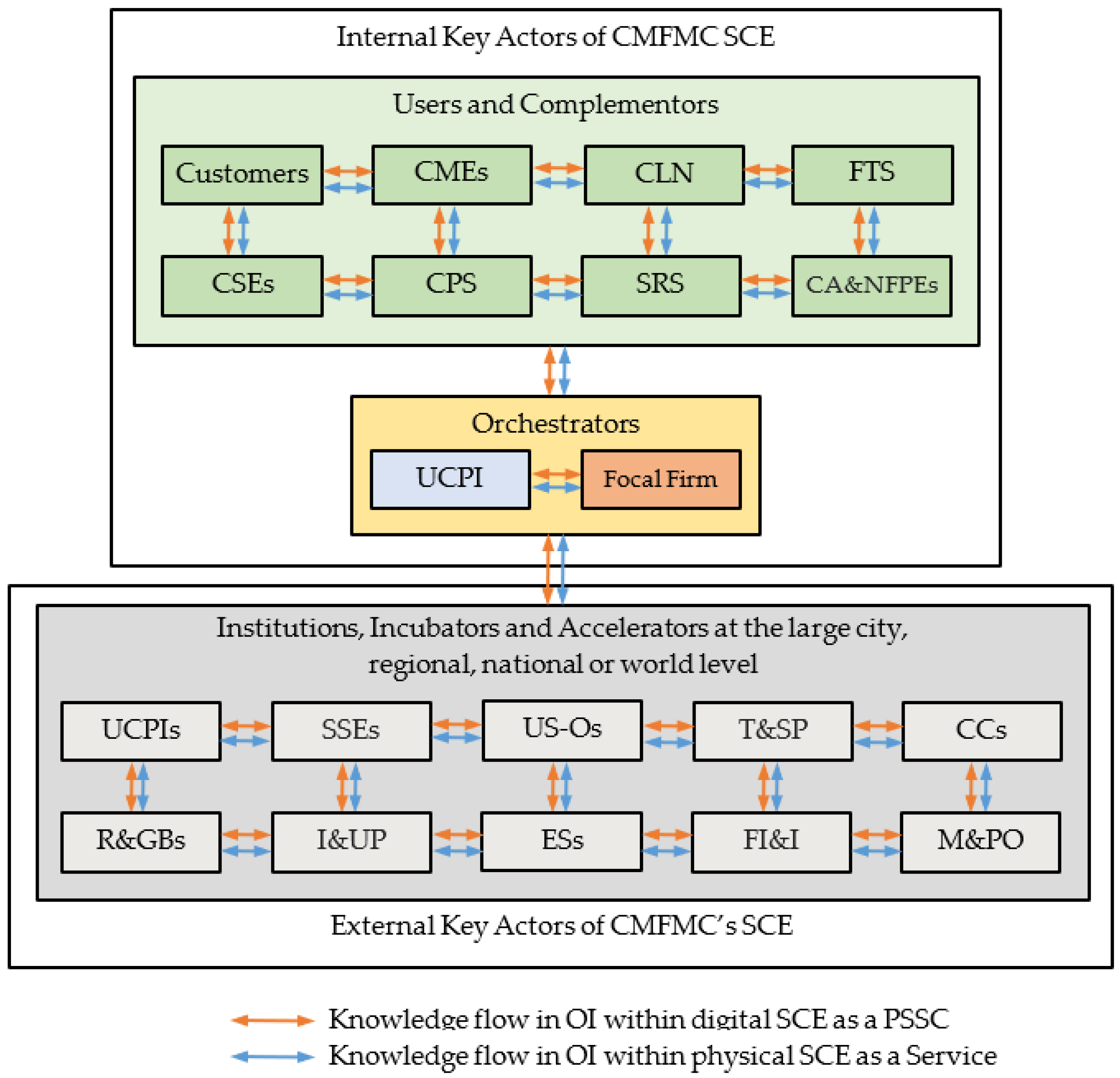 - RQ1: As shown in Table 3 (themes 1, 4, and 6), the spatial configuration and actor interactions emphasize collaboration hubs, shared facilities, and resource mapping. Our findings confirm that the SCE of a CMFMC consists of 19 key actors grouped into internal and external categories. The spatial configuration reflects both physical infrastructures (e.g., CMEs, CLN, etc.) and digital platforms (knowledge databases, registries). Respondents emphasized that orchestrators such as the UCPI are central in coordinating flows across these actors. This expands earlier conceptualizations of SCE by highlighting the dual modality: physical SCE as a service and digital SCE as a PSSC.