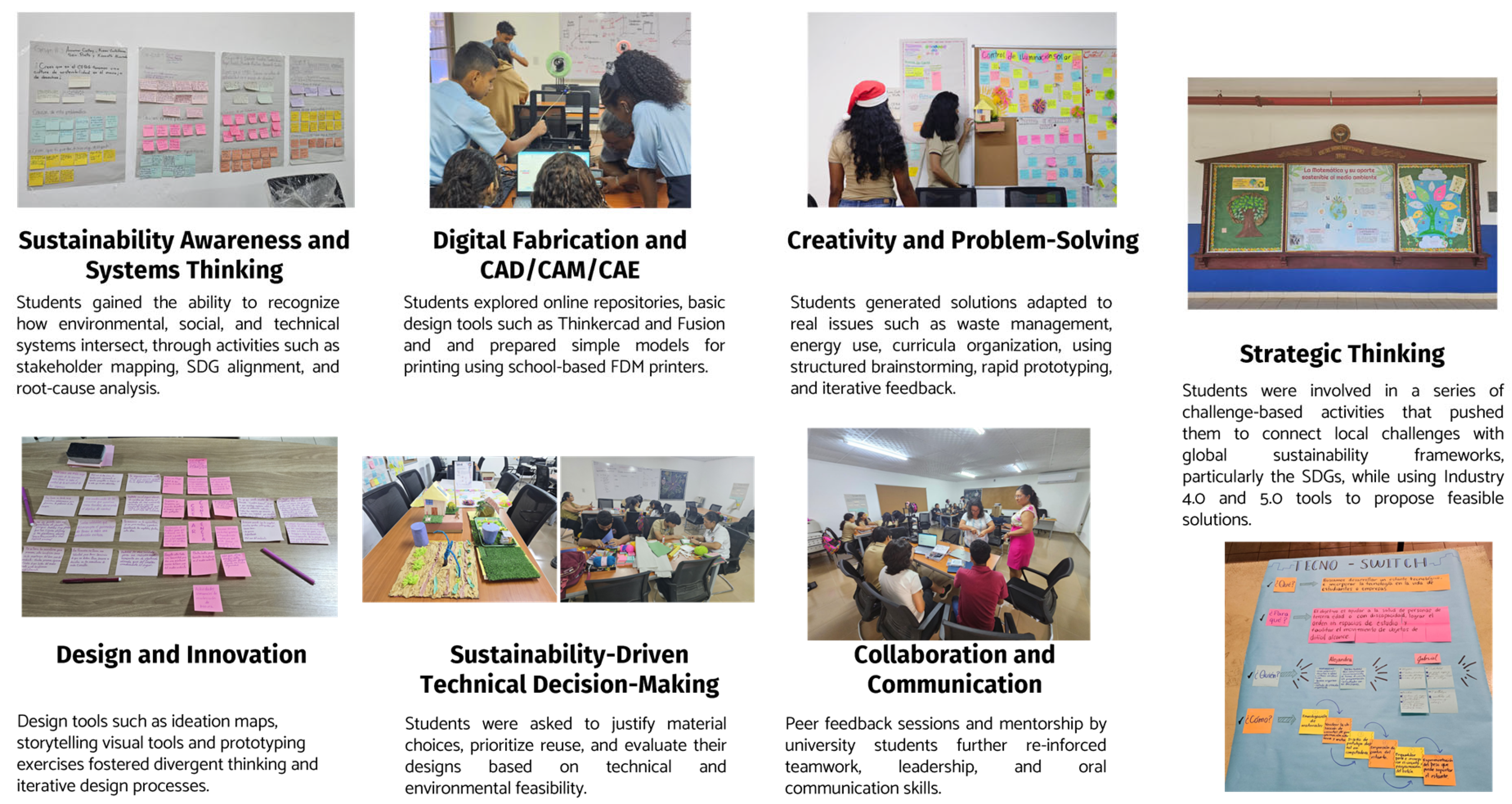- Creativity and Problem-Solving: Students generated and refined solutions adapted to real, school-based issues such as waste management, energy use, curricula, and classroom organization. Through structured brainstorming activities, rapid prototyping, and iterative feedback loops, they developed contextually relevant and technically feasible ideas. These creativity and problem-solving competencies were further developed during ideation workshops, visual mapping exercises, and prototyping sessions, processes detailed in the thematic competency tables on design and innovation and sustainability-driven technical decision making.