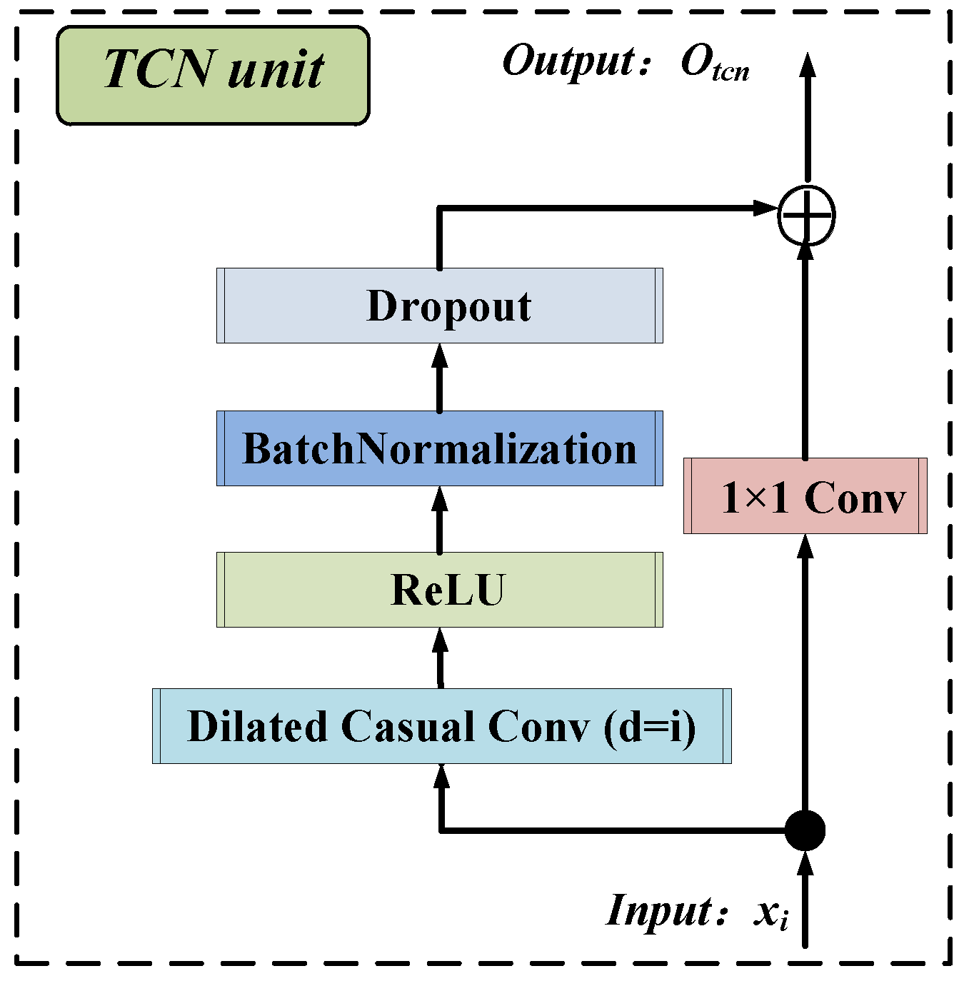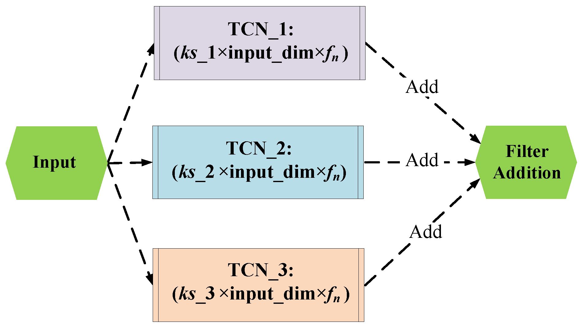 - Regarding the number of TCN blocks: Changing this structure parameter of the model (e.g., increasing TCN blocks quantities) does not bring desired accuracy improvement. Overly deep and complex model architectures increase the difficulty of model training, and the introduction of gradient issues can easily degrade model performance. More critically, blindly expanding the model structure also inflates the model’s parameter volume, thereby escalating computational costs. In this paper, we configure the TCN block to 2, as this architecture demonstrate acceptable prediction error during hyperparameter tuning.