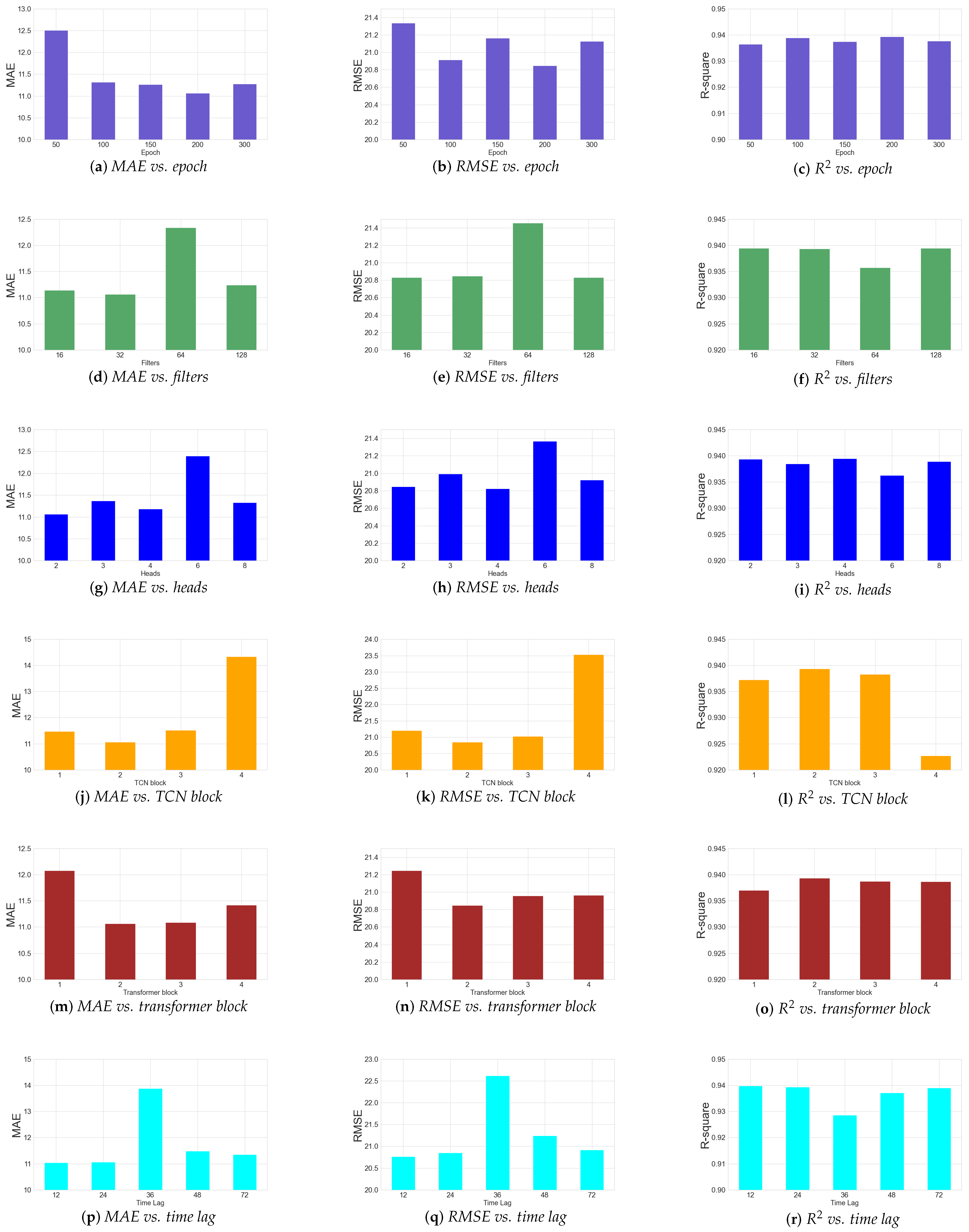 - Regarding the number of transformer blocks: The transformer block quantities also affect the model prediction performance, as observed in Figure 10m–o. Increasing or decreasing the number of blocks cannot achieve the optimal performance trade-off. Moreover, increasing the number of model blocks will also increase computational overhead without bringing significant performance gains. Finally, we empirically set the number of transformer blocks to 2 to reach a trade-off between model performance and computational complexity.