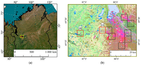The study area in the northern part of Krasnoyarsk Region, Taimyr, Russia (a), and sites of field experiments conducted in 2022–2025. (b) SB (Boganida River test site) is the background landscape; SA (Ambarnaya River test site) is situated in a landscape that has been industrial-affected and has a disturbed vegetation cover. The soil pits locations are indicated by the white dots on the Landsat image’s vegetation cover classification, July 2024 (b).