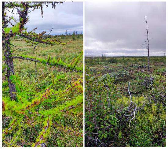 The background landscapes are characterized by low-growing birch (Betula nana) and sparse larch (Larix gmelinii) curtains, which are interspersed with a long moss–sphagnum and sedge–dwarf shrub layer and grass–lichen–moss bogs. The vegetation in industrial-affected areas exhibits signs of severe degradation as a result of the predominant type of impact, which is air pollution from enterprise emissions [21,22]. This is apparent in the replacement of typical moss and lichen species with grass and forb–grass groups, the severe damage to the shrub layer and living ground cover, and the drying out of the tree layer. These attributes, which suggest a significant alteration of the original ecosystems, are indicative of the transformed area (SA) that was examined (Figure 2).