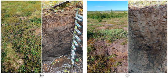 Vegetation cover of the surface and soil profiles at the locations of field experiments: (a) test site SB, soil type refers to Histic Cryosols, (b) test site SA, soil type refers to Turbic Cryosols. A photo taken in August 2023.